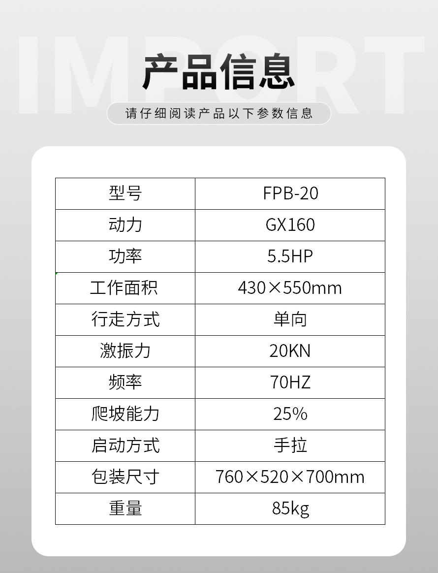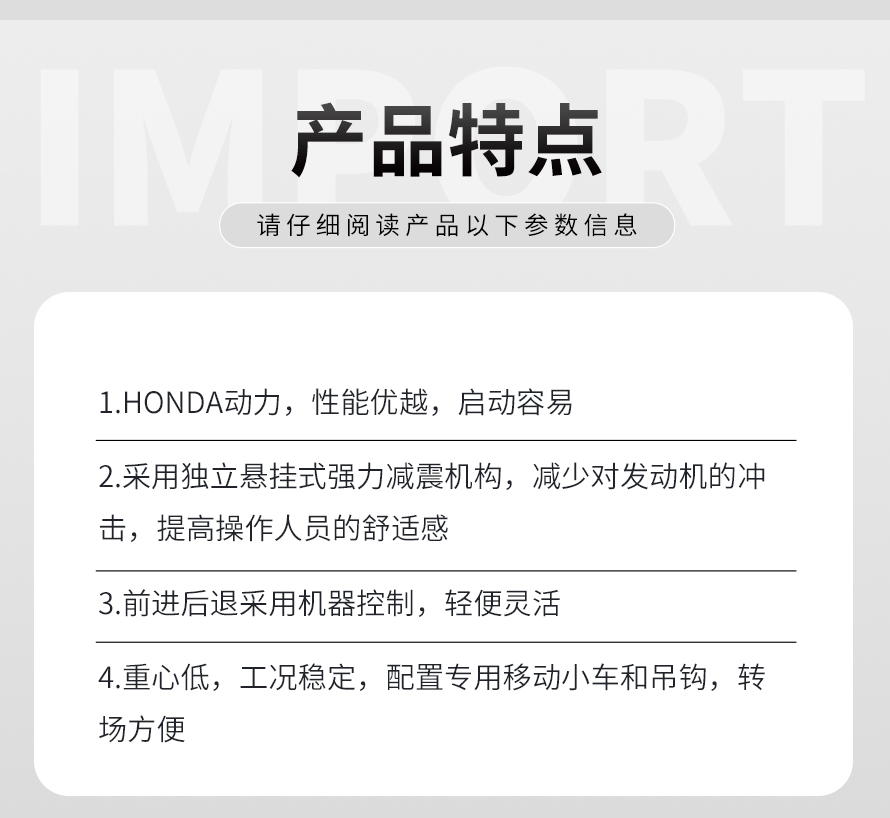 适用于路基边缘、桥涵、管道、沟槽底部等狭长地带的压实。 本田汽油动力,名牌品质保证。